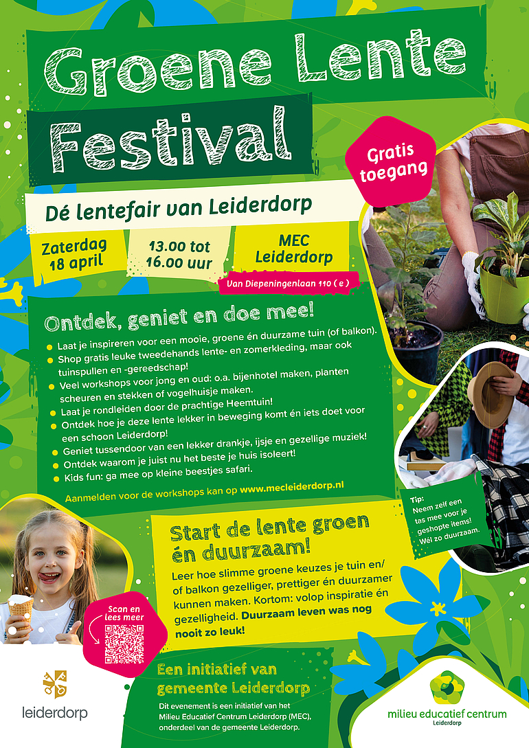 Kijk jij ook zo uit naar de lente? Heerlijk weer de tuin in of je balkon op? Kom dan op zaterdag 18 april 2026 zeker naar het Groene Lente Festival bij het Milieu Educatief Centrum. Daar beleef je een middag vol lentetuin-inspiratie en toffe workshops (gratis toegang). Shop ook gratis leuke items op de ruilmarkt.