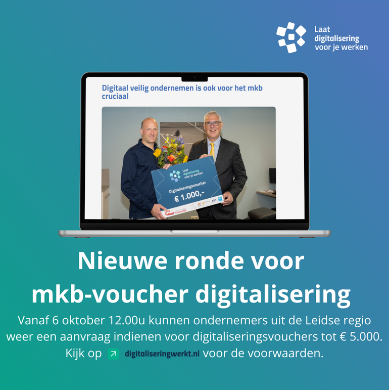 Vanaf maandag 6 oktober kan de voucher eenvoudig worden aangevraagd via de website digitaliseringwerkt.nl. Bij de aanvraag is een offerte nodig van een leverancier. Vraag deze dus op tijd aan. Meer informatie vindt u ook op genoemde website. Laatste voucherronde? Laat digitalisering voor je werken is een project van Economie071, de economische samenwerking in de Leidse regio. Deze samenwerking is opgeschaald en werkt vanaf juli 2025 onder de naam Key Region Leiden. Ondernemerschap versterken is daarbij nog steeds een belangrijke pijler. Er wordt daarom gekeken naar een vervolg van de vouchers in 2026. Dit is echter nog niet zeker. Benut daarom deze kans voordat het te laat is.