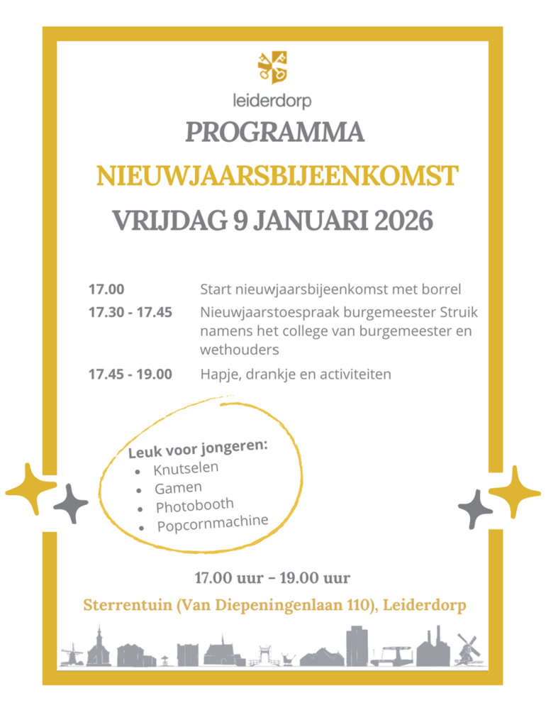 Bovenaan de afbeelding staat het logo van gemeente Leiderdorp. Daaronder staat de titel: 'Programma nieuwjaarsbijeenkomst’ met daaronder de datum: vrijdag 9 januari 2026.