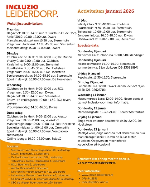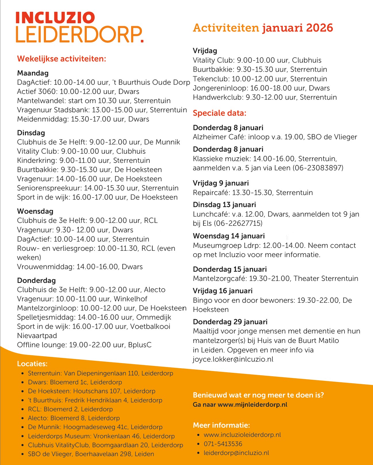 Wees dan van harte uitgenodigd bij één van de vele activiteiten bij Incluzio: van koffie tot creatief, van wandelen tot samen eten. Ga bijvoorbeeld naar de koffiemiddag in Sterrentuin of naar een van de activiteiten in januari. Kijk voor meer activiteiten op incluzioleiderdorp.nl.