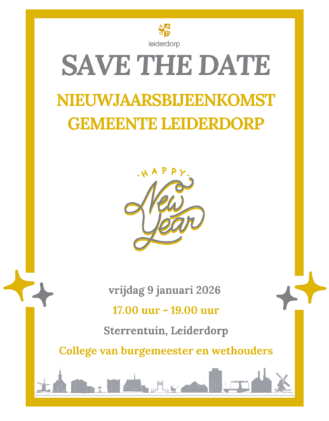 Bovenaan de uitnodiging staat het logo van gemeente Leiderdorp. Daaronder staat de titel: 'Save the date', met daaronder de tekst: ‘Nieuwjaarsbijeenkomst gemeente Leiderdorp.’ In het midden van de uitnodiging staat een illustratie met de tekst ‘Happy new Year’.