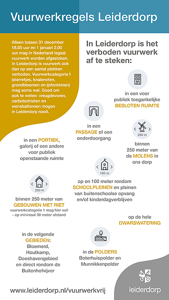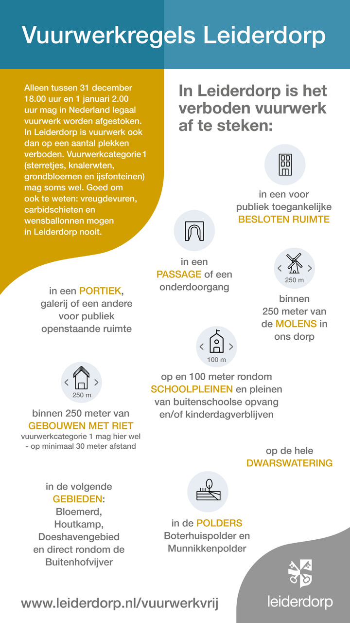 Op www.leiderdorp.nl/vuurwerkvrij kunt u meer lezen over de lokale vuurwerkregels.